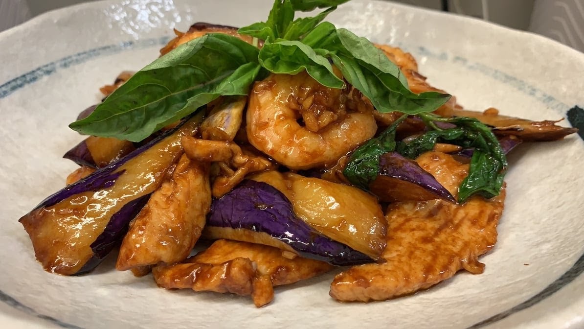 Rasied eggplant sauteed with chicken and prawns in basil sauce. spicy.